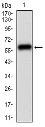 Figure 2: Western blot analysis using CAMK2G mAb against HEK293 (1) and CAMK2G (AA: 322-481)-hIgGFc transfected HEK293 (2) cell lysate. |