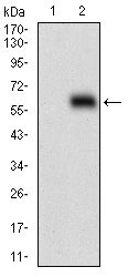 Figure 2: Western blot analysis using HOXB4 mAb against HEK293 (1) and HOXB4 (AA: 16-251)-hIgGFc transfected HEK293 (2) cell lysate. |
