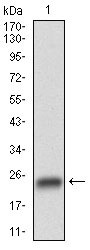 Figure 1: Western blot analysis using GSK3B mAb against human GSK3B (AA: 2-159) recombinant protein. (Expected MW is 20.3 kDa)