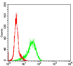 Figure 2: Flow cytometric analysis of NIH/3T3 cells using GSK3B mouse mAb (green) and negative control (red). |
