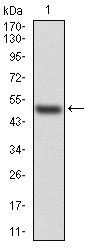 Figure 1:Western blot analysis using HSPB2 mAb against human HSPB2 (AA: 1-182) recombinant protein. (Expected MW is 46.2 kDa)