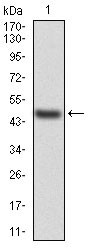 Figure 2:Western blot analysis using TTR mAb against human TTR (AA: 1-147) recombinant protein. (Expected MW is 45.8 kDa)