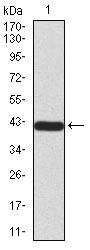 Figure 2:Western blot analysis using TARDBP mAb against human TARDBP (AA: 126-260) recombinant protein. (Expected MW is 41.5 kDa)