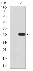 Figure 3:Western blot analysis using TARDBP mAb against HEK293 (1) and TARDBP (AA: 126-260)-hIgGFc transfected HEK293 (2) cell lysate. |