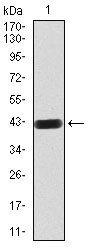 Figure 2:Western blot analysis using Rab8 mAb against human Rab8 (AA: 68-207) recombinant protein. (Expected MW is 42 kDa)