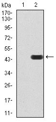 Figure 3:Western blot analysis using MMP14 mAb against HEK293 (1) and MMP14 (AA: 112-246)-hIgGFc transfected HEK293 (2) cell lysate. |