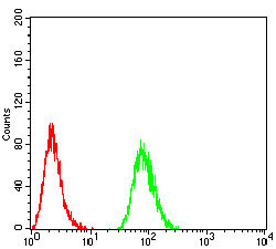 Figure 3:Flow cytometric analysis of HeLa cells using SK2 mouse mAb (green) and negative control (red). |