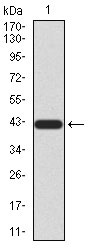 Figure 2:Western blot analysis using MECP2 mAb against human MECP2 (AA: 7-148) recombinant protein. (Expected MW is 41.7 kDa)