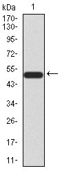 Figure 2:Western blot analysis using mTOR mAb against human mTOR (AA: 2311-2529) recombinant protein. (Expected MW is 50.8 kDa)