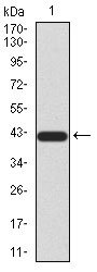 Figure 2:Western blot analysis using SIRT3 mAb against human SIRT3 (AA: 155-290) recombinant protein. (Expected MW is 41.3 kDa)