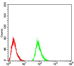 Figure 3:Flow cytometric analysis of Hela cells using TSHB mouse mAb (green) and negative control (red). |