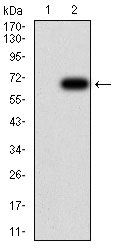 Figure 3:Western blot analysis using HDAC6 mAb against HEK293 (1) and HDAC6 (AA: 482-800)-hIgGFc transfected HEK293 (2) cell lysate. |