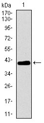 Figure 1: Western blot analysis using MRPL42 mAb against human MRPL42 recombinant protein. (Expected MW is 41.2 kDa)