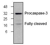 The caspase family of cysteine proteases play a key role in apoptosis. Caspase-3 is the most extensively studied apoptotic protein among caspase family members. Caspase-3 is synthesized as inactive pro-enzyme that is processed in cells undergoing apoptosis by self-proteolysis and/or cleavage by another upstream protease. The processed form of caspase-3 consists of large (17 kD) and small (12 kD) subunits which associate to form an active enzyme. The active caspase-3 proteolytically cleaves and activates other caspases, as well as relevant targets in the cells (e.g., PARP and DFF).