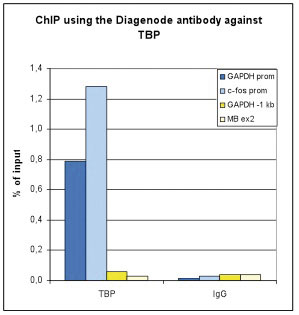 Figure 1 ChIP-seq results obtained with the monoclonal antibody directed against TBP ChIP was performed with 5 μg of the antibody against TBP on sheared chromatin from 1 million HeLaS3 cells using the “Auto Histone ChIP-seq” kit on the IP-Star automated system. The IP’d DNA was analysed by QPCR with optimized PCR primer pairs for the promoters of the active GAPDH and c-fos genes, used as positive control targets, and for a region 1 kb upstream of the GAPDH promoter and the coding region of the inactive MB gene, used as negative control targets (figure 2A). The IP’d DNA was subsequently analysed with an Illumina Genome Analyzer. Library preparation, cluster generation and sequencing were performed according to the manufacturer’s instructions. The 36 bp tags were aligned to the human genome using the ELAND algorithm. Figure 2 shows the peak distribution in 50 kb regions surrounding the GAPDH, c-fos, ACTB and MCL1 genes (figure 2B, C, D and E, respectively). These results clearly show a localisation of TBP at the promoters of actively transcribed genes. |