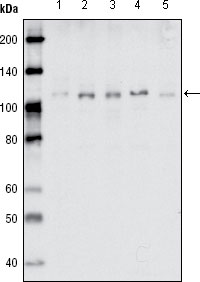 Figure 1: Western blot analysis using EhpB1 mouse mAb against MDA-MB-468 (1), MDA-MB-453 (2), MCF-7 (3), T47D (4) and SKBR-3 (5) cell lysate.