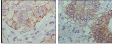 Figure 2: Immunohistochemical analysis of paraffin-embedded human lung cancer (left) and colon cancer (right) showing cytoplasmic localization with DAB staining using EphB1 mouse mAb. |