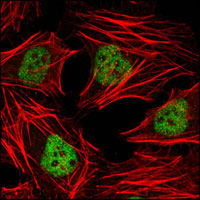 Figure 2: Confocal immunofluorescence analysis of Hela cells using HDAC3 mouse mAb (green). Red: Actin filaments have been labeled with DY-554 phalloidin. |