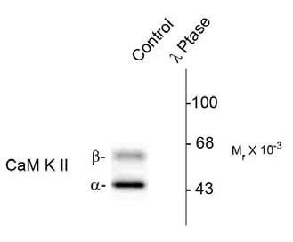 Western blot of rat brain lysate showing specific immunolabeling of the ~50k α- and the ~60k β-CaM Kinase II phosphorylated at Thr286 (Control). The phosphospecificity of this labeling is shown in the second lane (lambda-phosphatase: λ-Ptase). The blot is identical to the control except that it was incubated in λ-Ptase (1200 units for 30 min) before being exposed to the Anti-Thr286 CaM Kinase II. The immunolabeling is completely eliminated by treatment with λ-Ptase. |