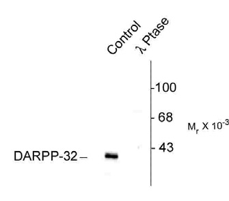 DARPP-32 is a dopamine (DA) and cAMP-regulated ~32k phosphoprotein that is associated with dopaminoceptive neurons (Fienberg et al., 1998). The protein inhibits protein phosphatase I when it is phosphorylated on Thr34. In contrast, when DARPP-32 is phosphorylateThr75 the protein acts as an inhibitor of PKA (Bibb et al., 1999). Phosphorylation of DARPP-32 is thougto play a critical role in the regulation of dopaminergic neurotransmission. In addition, the activity of DARPP-32 is also thought to play important roles in the actions of alcohol, caffeine and Prozac? (Maet al., 2002; Lindskog et al., 2002; Svenningsson et al., 2002).