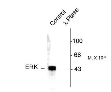 Western blot of human T47D cell lysates showing specific immunolabeling of ~42-44k ERK/MAPK protein phosphorylated at Thr202/Tyr204 (Control). Phosphospecificity is shown in the second lane (lambda-phosphatase: λ-Ptase). The blot is identical to the control except that it was incubated in λ-Ptase (1200 units for 30 min) before being exposed to the phospho Thr202/Tyr204 ERK/MAP antibody. The immunolabeling is completely eliminated by treatment with λ-Ptase.