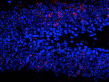 Immunostaining of granule cells in the dentate gyrus of saline treated mouse showing ERK/MAPK when phosphorylated at Thr202/Tyr204 (red) and nuclei (blue). Photo courtesy of Robert Wine. |