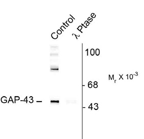 Western blot of rat cortex lysate showing specific immunolabeling of the ~50k Gap-43 protein phosphorylated at Ser41 (Control). The phosphospecificity of this labeling is shown in the second lane (lambda-phosphatase: λ-Ptase). The blot is identical to the control except that it was incubated in λ-Ptase (1200 units for 30 min) before being exposed to the GAP-43 Ser41 antibody. The immunolabeling of GAP-43 is completely eliminated by treatment with λ-Ptase. |