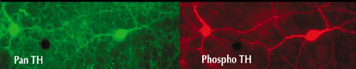 Tyrosine hydroxylase (TH) is the rate-limiting enzyme in the synthesis of the catecholamines Dopamine and Norepinephrine. TH antibodies can therefore be used as markers for dopaminergic and noradrenergic neurons in a variety of applications including depression, schizophrenia, Parkinson’s disease and drug abuse (Kish et al., 2001; Zhu et al., 2000; Zhu et al., 1999). TH antibodies can also be used to explore basic mechanisms of dopamine and norepinephrine signaling (Witkovsky et al., 2000; Salvatore et al., 2001; Dunkley et al., 2004). The activity of TH is also regulated by phosphorylation (Haycock et al., 1982; Haycock et al., 1992; Jedynak et al., 2002). Phospho-specific antibodies for the phosphorylation sites on TH can be used to great effect in studying this regulation and in identifying the cells in which TH phosphorylation occurs.