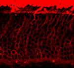 Immunohistochemical staining of mouse retinal section showing specificimmunolabeling of the rhodopsin protein in the rod spherules. Photo courtesyof Mary Raven, University of California, Santa Barbara, CA. |