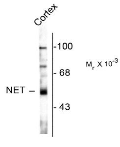 Western blot of rat cortex homogenate showing specific immunolabelingof the ~ 55k norepinephrine transporter protein. |