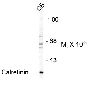 Western blot of rat cerebellum (CB) lysate showing specific immunolabeling of the~ 29k calretinin protein.