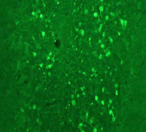 Immunostaining of rat cerebellum showing fluorescenceof calretinin containing cells. |