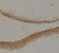 Immunohistochemical staining of rat dentate gyrus showing specificimmunolabeling of the prox1 protein. Photo courtesy of Justin Kievits and Teresa Milner, Weill Cornell Medical College. |