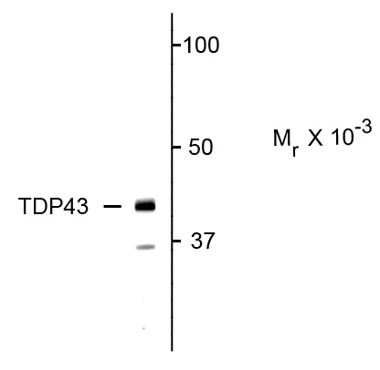 Western blot of neonatal rat brain lysate showing specific immunolabeling ofthe ~ 43 kDa TDP43 protein. |