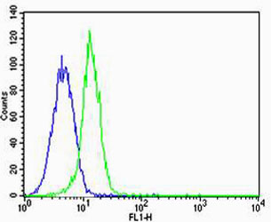Flow cytometric analysis of PC-12 cells using Park7 (DJ-1) Antibody(green, APR11964G) compared to an isotype control of rabbit IgG(blue). APR11964G was diluted at 1:100 dilution. An Alexa Fluor? 488 goat anti-rabbit lgG at 1:400 dilution was used as the secondary antibody.