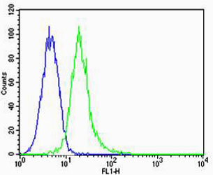 Flow cytometric analysis of PC-12 cells using Park7 (DJ-1) Antibody(green, APR12839G) compared to an isotype control of rabbit IgG(blue). APR12839G was diluted at 1:500 dilution. An Alexa Fluor? 488 goat anti-rabbit lgG at 1:400 dilution was used as the secondary antibody.