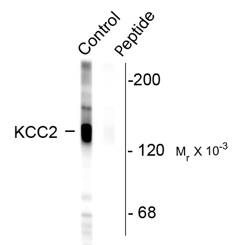 Western blot of rat hippocampal homogenate showing specific labeling ofthe ~ 135k KCC2 protein (Control). Immunolabeling is blocked bypreadsorption with the phospho-peptide used as antigen (Peptide) butnot by the corresponding dephospho-peptide (not shown). |