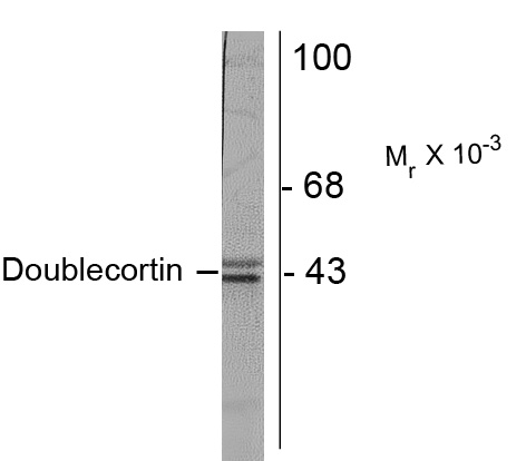 Western blot of postnatal day 3 rat brain lysate showing specific immunolabeling of the ~35 & 45k doublecortin protein.