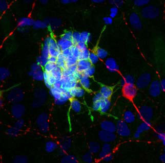 Immunofluorescence of cultured rat neurons showing strong cytoplasmicstaining of doublecortin (green) in developing neurons and GFAP in red. |