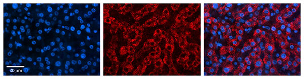 USE1 antibody - middle region (AMM08442G) in Human Liver Tissue cells using Immunohistochemistry USE1 antibody - middle region (AMM08442G) Catalog Number: AMM08442G Formalin Fixed Paraffin Embedded Tissue: Human Liver Tissue Observed Staining: Cytoplasm in hepatocytes Primary Antibody Concentration: 1:100 Secondary Antibody: Donkey anti-Rabbit-Cy3 Secondary Antibody Concentration: 1:200 Magnification: 20X Exposure Time: 0.5 - 2.0 sec