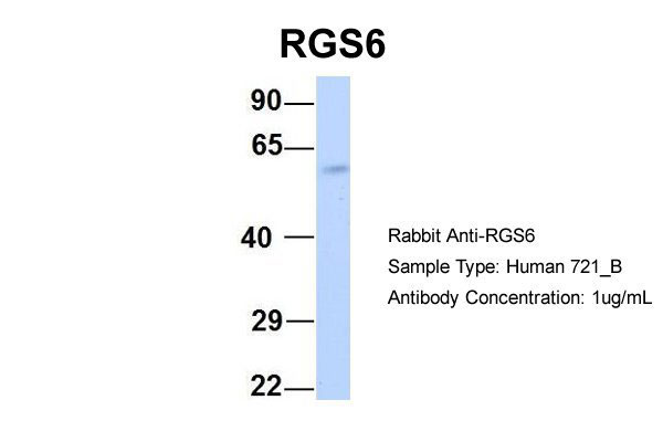 Host: Rabbit Target Name: RGS6 Sample Tissue: Human 721_B Antibody Dilution: 1.μg/ml RGS6 is strongly supported by BioGPS gene expression data to be expressed in Human 721_B cells |