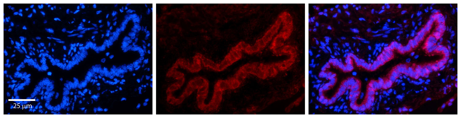 TMEM135 antibody - N-terminal region (APR10482G) Catalog Number: APR10482G Formalin Fixed Paraffin Embedded Tissue: Human Bronchial Epithelial Tissue Observed Staining: Membrane of bronchial epithelial tissue Primary Antibody Concentration: 1:100 Secondary Antibody: Donkey anti-Rabbit-Cy3 Secondary Antibody Concentration: 1:200 Magnification: 20X Exposure Time: 0.5 - 2.0 sec