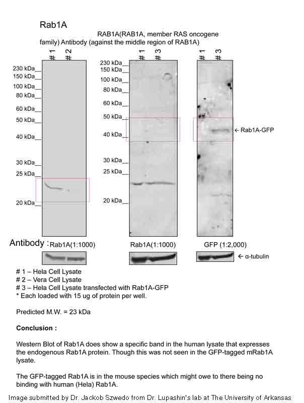 Sample Type: 1. Human Cervical Cancer cell lysate (15ug) 2. Monkey Fibroblast cell lysate (15ug) 3. Human Cervical Cancer Cell transfected with Rab1A-GFP (15ug) Primary Dilution: 1:1000 Secondary Antibody: goat anti-Rabbit Secondary Dilution: 1:40,000 Image Submitted by: Dr. Jakob Szwedo, Dr. Lupashin's Lab University of Arkansas for Medical SciencesSee Customer Feedback tab for detailed information. |