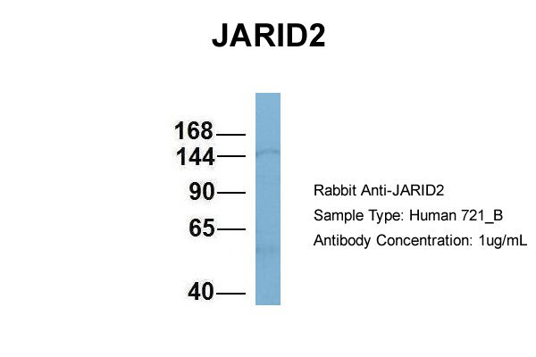 Host:Rabbit Target Name:JARID2 Sample Tissue:721_B Antibody Dilution: 1.0μg/ml JARID2 is strongly supported by BioGPS gene expression data to be expressed in Human 721_B cells |