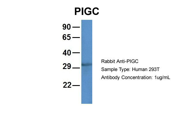 Host:Rabbit Target Name:PIGC Sample Tissue:Human 293T Antibody Dilution: 1.0μg/mlPIGC is strongly supported by BioGPS gene expression data to be expressed in Human HEK293T cells |