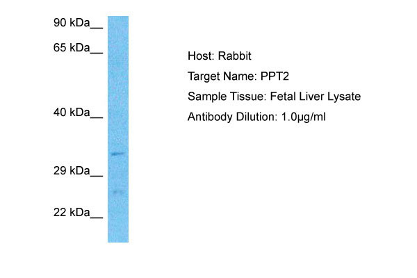 Host: Rabbit Target Name: PPT2 Sample Tissue: Fetal Liver lysates Antibody Dilution: 1.0μg/ml |