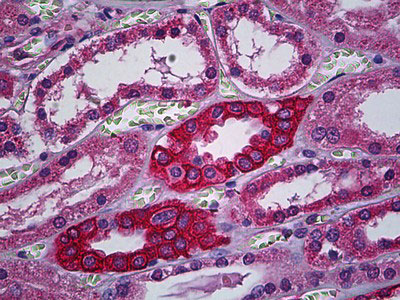 Anti-CACNA2D2 antibody IHC of human kidney, tubules. |