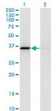 Western blot of MDH1 expression in transfected 293T cell line by MDH1 monoclonal antibody, clone...