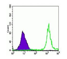 Flow cytometric analysis of Jurkat cells using anti-PARP mAb (green) and negative control (purple).