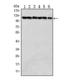 Western blot analysis using PARP mouse mAb against Jurkat (1), K562 (2), HeLa (3), Raji (4), THP-1 (5) and SW620 (6) cell lysate. |